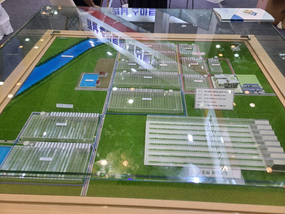 具体的には、韓国の「スマートファーム革新バレー事業」の概要を示す部分について、慶南スマートファーム革新バレーの全体像を示した模型の写真が引用されています。よろしくご笑覧ください。
